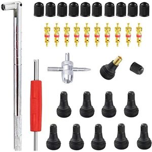 TR413 Valve Stem: Snap-in rubber car tire valve stems for 0.453” (11.5mm) diameter tubeless rim holes. Installation: Remove the old valve stems and reinstall the new valve stems, no need to worry about scratching the wheels or destroying the valve stems. The tool sets are easy to carry and use. Quickly remove or install the tire valve. Pull the valve stem with the principle of leverage, which can save your effort effectively. Tool Material: The tire valve stem puller is made of high quality alloy, sturdy and durable for a long service time. Valve: Zinc alloy inside + rubber outside. Single Valve Double Head Remover: Plastic handle + sturdy steel rod with corrosion-resistant plating. Suitable for tubeless tire repair for passenger cars, motorcycles, ATVs, off-road vehicles and trucks. Package: 10 TR413 valve stems with 10 valve stem cores + 1 4-way valve tool + 1 double-head valve core remover + 1 valve removal tool.