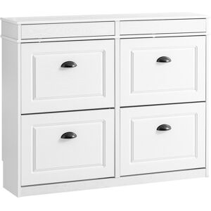 [Spacious & Slim Dimensions] Measuring W103 x D23 x H82 cm, this narrow shoe cabinet is ideal for small hallways and tight corridor spaces. Made from MDF(E1)+PB(E1), it supports up to 41kg, combining strength and style for everyday use [Optimized Shoe Storage] Featuring 4 flip drawers, the unit accommodates up to 16 pairs of shoes, keeping your shoe storage cabinet neat and organized. Perfect for families or shared spaces that need a space-saving solution [Modern & Versatile Design] The white vintage wood grain effect finish blends seamlessly into any decor. The slim cabinet fits behind doors, along walls, or under mirrors. Use it as a shoe cupboard, hallway rack, or entryway unit [Multi-Functional Top Surface] The flat top serves as a decor display, key drop zone, or spot for air fresheners, making this shoe storage cabinet not only practical but also a stylish sideboard in your home [Compact Design with Hidden Drawer] Equipped at the front with a push-to-open drawer, ideal for storing shoe polish, keys, or other small items, this entryway shoe cabinet keeps your entrance neat and organized. [Eco-Friendly & Modular System] Packed in a 100% recyclable box, this hallway shoe cabinet combines with SoBuy models FSR64, FSR78, FSR94, and FSR82 to create a personalized modular shoe storage system Product Details Material: MDF(E1)+PB(E1). Color: White. Dimensions: W103 x D23 x H82 cm. Weight: 28.9kg. Load capacity: 41kg. Item comes in a flat pack and requires self-assembly. Detailed instructions supplied. The decorative elements are not included in the delivery.