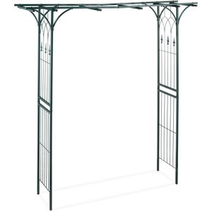 This metal rose arch does not only provide a proper climbing aid to your plants, but is also quite nice to look at. With its stylish ornaments, it adds to a romantic and decorative look in your garden and highlights ivy, roses, clematis, wine and more. A special highlight is of course the gate that can be closed using an iron latch. For more security, just use pegs for firm footing. Rose Arch with Gate Details - Size H x W x D: app. 215 x 115 x 43 cm - Entry H x W: app. 203.5 x 92 cm - Total height door: app. 124.5 cm - Weight: app. 9 kg - Material: Powder-coated iron - Colour: Dark-green Decorative Garden Trellis - For ivy, roses, clematis, wine, raspberries etc. - Provides growth support - Decorative and eye-catching - Insert into the ground for additional safety - Robust and weatherproof thanks to powder-coating Included in Delivery - 1x Rose Arch in Pieces - 8 x Pegs - Assembly material and instructions - Decorative items shown in product photos are not included