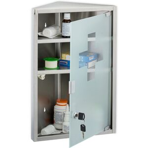 With this corner medicine cabinet, you can keep your medications organised. With its 3 compartments, this cupboard offers ample space to neatly store medications, bandages, and first aid kits. Important and potentially dangerous medications are safeguarded from curious children and unauthorised individuals thanks to the lockable door. The first aid cabinet looks great with its modern combination of steel and frosted glass. Medicine Cabinet in Detail - Dimensions H x W x D: approx. 45 x 30 x 17.5 cm - Compartments W x D: approx. 29 x 15.5 cm - Height of lower compartment: approx. 22 cm - Height of upper compartments: approx. 9.5 cm - Weight: approx. 2.7 kg - Material: Steel, glass - In various colours Wall-Mounted First Aid Cabinet for the Home - Perfect for the bathroom, offices or public facilities - 3 compartments provide storage space for medicines and bandages - Lockable medicine cabinet for childproof storage - Modern pharmacy cabinet made of steel and frosted glass door - For