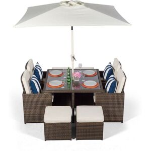 GENERAL DESCRIPTION The Giardino Cube rattan dining set is a compact outdoor dining set that can be neatly stored within the dining table. It is available in stylish mixed grey or stunning mixed brown rattan weave. With a modern look and clean lines, this set serves as a focal point for outdoor spaces. The rattan dining chairs have flip-up backrests and padded seat and back cushions for comfort. TECHNICAL SPECIFICATIONS Material: Aluminium frames and polyethylene all-weather rattan UV resistant Temperature range: -15°C to 60°C Cushion thickness: 5cm (seat and back), 8cm (stool) Cushion covers: Removable zip-off for easy maintenance Water-resistant fabrics OTHER INFORMATION The rattan dining chairs come fully assembled. Maintenance is simple with just a damp cloth or garden hose on a gentle setting.