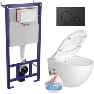 GENERAL DESCRIPTION Toilet set includes a wall-hung toilet frame, rimless toilet with thermostatic bidet function, soft-close seat, and a matte black dual flush plate. TECHNICAL SPECIFICATIONS Recommended water pressure range: 0.3-0.5 MPa Functional water pressure range: 0.05-0.8 MPa Hygienic reserve: 3 l Water volume in the tank: 9 l Water connection from the back or top via G1/2'' mounting holes Standard small flush setting: 3 l Standard large flush setting: 6 l Small flush range: 2.5-3.5 l Large flush range: 6-9 l Load test: 400 kg COMPATIBILITY AND ACCESSORIES Compatible with all Swiss Aqua Technologies installation systems and pre-wall tanks. INSTALLATION For installation in front of a load-bearing wall or in a plasterboard structure. For installing a wall-hung toilet with a connection distance of 180 mm or 230 mm. For floor thicknesses from 0 to 200 mm. USAGE Features a dual flush system with hygienic reserve. Soft-close seat for quiet operation.