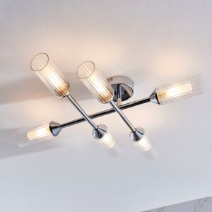 This statement ceiling pendant light is heritage inspired. The fitting features a matt gold finish frame with twisted glass rods and exiting detailing. It is versatile enough to work into a contemporary or traditional theme with equal ease. FEATURES: * Ceiling pendant light * Matt gold finish * Clear ribbed glass * Takes 6 lamps * Dimmable with suitable lamps / dimmer switch * Height adjustable at the point of installation SIZE: * Height: 40 - 160 cm * Diameter: 50 cm BULB: * Accommodates 6 x 40 watt max Small Edison Screw Candle Lamp (not included) * Compatible with LED lamps
