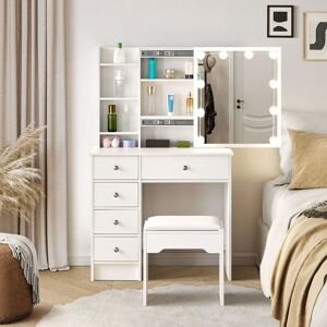 GENERAL DESCRIPTION This dressing table is made of high-quality E1 particle board with a thick 18 mm tabletop that can support a greater load. It features a stylish sliding mirror design with three hidden storage shelves for cosmetics and decorations. The table includes ample storage space with five drawers and three partitions, helping to keep your items organized. A comfortable dressing stool with a thick sponge cushion is also included. TECHNICAL SPECIFICATIONS Material: High quality E1 particle board Dressing table size: 80 x 40 x 130 cm Make-up stool size: 40 x 24 x 40 cm Desktop thickness: 18 mm Color: White 3 Color Lighting Modes: Cool white (6000K), natural light (4000K), warm yellow (3000K) Stool Weight Capacity: 100 kg Light source type: LED (10 bulbs) Bulb diameter: 4.5 cm Maximum adjustable length: 4 m Cable Length: 5.4 m Color temperature: 3000-7000K Plug type and power supply: USB, 5V 2A Material: ABS lamp holder and PC lampshade COMPATIBILITY AND ACCESSORIES Package