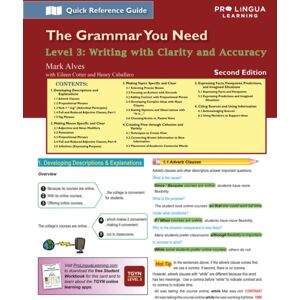 The Grammar You Need series (three levels) covers essential grammar for the purpose of writing in English in an academic setting.Each fold-out card provides clear, full-color visuals showing how the grammar structures work and how to apply them.Students can download free workbooks from ProLinguaLearning.com and can also take advantage of the powerful web application for this series at TheGrammarYouNeed.com.Level 3 of the series, Writing with Clarity and Accuracy, develops students understanding and control of adjective, noun, and adverb clauses; reduced clauses; and the grammar elements necessary to create clear flow in academic writing, to express facts, viewpoints, predictions, and hypotheses, and to cite sources and use the ideas of other writers.