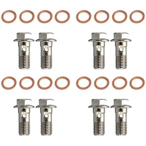 This item is for 8 stainless steel M10 x 1.25mm banjo bolts, suitable for many motorcycle applications including late model Suzukis and most , and models, including most Tokico calipers. Also for some cars. The item comes with 16 copper banjo washers. Bolts are measured from the underside of the screw head to the tip of the threads at 18mm long. Name: Banjo Bolt with Washers Description: Brand New Size: M10 x 1.25mm Total Length: 28mm Note: Instruction not included. Material: Metal Color: As shown Package Contents: 8 x Banjo Bolts 16 x Copper Banjo Washers Only the above package content, other products are not included. Note: Light reflection and different displays may cause the color of the item in a little different from the real thing. The measurement allowed error is +/- 1-3 cm.