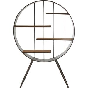 Its large frame is made from metal and is supported by matching legs that are configured at an angle. The frame's round design is countered by vertical lines that descend like strings over a guitar's sound hole. Four shelves made from fir wood emerge from the sides, their golden colour distinguished clearly against the weathered metal.
