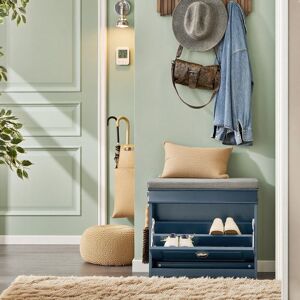 Modern design shoe cabinet shoe bench in blue color is really eye-catching and impressive anytime and anywhere. It consists of storage for several shoes in a handy flip down section beneath cushioned seat area. The seat cushion which is removable is ideal for comfortable sitting while putting on and taking off shoes. The pull out drawer on the side is ideal for storing shoe polish and brush, keys, and other small items. The hook on the other side is ideal for hanging shoe horns. Please note the hook can bear a maximum load of 2kg. 24cm in depth, the shoe bench is narrow enough to fit even in a small corridor. Tidies up your hallway or porch nicely hiding all your shoes and the other items! ClassicLiving