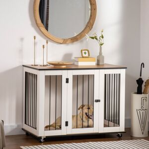 A safe space for pets, whilst bringing style this versatile PawHut dog crate cage does it all. End-table style furniture serves as crates for dogs and functions as a stylish coffee table or side table that can be placed in any living space. Made from steel, each bar is plugged into the frame for strength and durability. With the large front door, pets can easily get in and out. Doors are lockable, so you can leave the room knowing they'll stay put. - Can be used as a dog crate furniture, nightstand, or an end table. - Door allows your cat to enter easily. - Five wheels for easy movement and one wheel in the middle enhances support. - Elevated base design prevent your cat from damp and cold. - Steel fence provides adequate ventilation and convenience for observation. - Suitable for large-sized dogs up to 30 kg, up to 60 cm in body length. - Assembly required - Colour: White, Dark Walnut. - Material: Particle Board, Steel. - Overall Dimension: 106W x 60D x 82H cm. - Interior Space: 99.4W x 53.8D x 72.4H cm. - Front Door Dimension: 38.4W x 71.8H cm. - Bottom Height to the Ground: 7.8 cm. - Wheel Dimension: Dia 4 cm. - Item Label: D02-086 PawHut