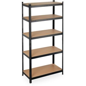 The load shelf offers plenty of space to keep things tidy. As a basement shelf, workshop shelf, storage shelf, in the garage or garden shed, it provides essential storage space for heavy items. Store tyres, machinery, tools and other heavy equipment. The 5 shelves are adjustable, so you can arrange the rack to suit your needs. If you need to, you can divide the shelf and use it as a workbench. Thanks to the simple plug-in mechanism, the storage unit can be assembled in no time at all. Tip: The practical plug-in system requires no screws, so assembly is quick and easy. All you need is a rubber mallet. Wear gloves when assembling. Heavy Duty Shelving in Detail - Size H x W x D: approx. 153 x 91 x 30.5 cm - Size of MDF board W x D: approx. 90.5 x 29.5 cm - Load capacity per level: approx. 360 kg - Total load capacity: approx. 1800 kg - Weight: approx. 18.5 kg - Material: Steel, MDF, Plastic - Colour: Black Loading Shelf for Tools, Crates and More - Shelf can be divided - 2 work benches