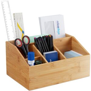 This utensil box provides plenty of storage space for pens, rulers, scissors and many more supplies. Use the long slot in the back as a DIN A5 letter or document holder. The wider compartment up front can be for things like a sticky or simple note pad. This way, you are well-equipped to keep your desk tidy and can focus on your work. Also ideal for kitchen or bathroom to use on the counter or shelf to keep everyday items within easy reach. Desk Organizer Details - Size H x W x D: app. 14 x 28 x 19.5 cm - Weight: app. 1.1 kg - Material: Bamboo - Colour: Natural 6-Compartment Bamboo Organiser - Letter rack (back) H x W x D: app. 13.4 x 26.4 x 6 cm - Note pad holder (right) H x W x D: app. 13.4 x 9.7 x 11.5 cm - 4 Pen holders H x W x D each: app. 9.5 x 7.5 x 5.3 cm Organisation Tray - Stylish office tidy made of natural bamboo - 6 Compartments for pens, ruler, scissors, etc. - Keep everything neatly and tidily withing reach - Ideal for the table or kitchen counter for cutlery, etc