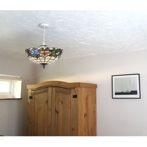 Lily design tiffany style non electric easy fit ceiling light shade. Fits on any lamp holder including European. Ivory champagne glass offers a soft diffused light combined with blues, pinks and green for a colourful border. Ideal for any living space in the home blending colours with traditional style. Hand crafted glass , individual pieces assembled and welded together by hand ensures each piece is unique with the tiffany style charm. Astoria Grand
