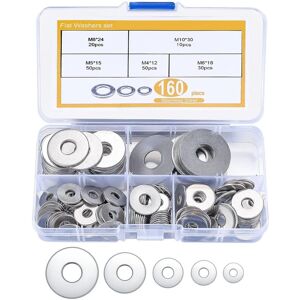 "Product Information - Product Name: Flat Washer Disc - Material: Stainless Steel - Color: Silver - Quantity: 160 pieces The package includes: M4x12mm - 50 pieces M5x15mm - 50 pieces M6x18mm - 30 pieces M8x24mm - 20 pieces M10x30mm - 10 pieces Features: - These flat repair discs are made of high quality stainless steel, sturdy and durable. - A standard disc with a center hole, used to distribute the load on surfaces fixed with screw fixings. - All stainless steel washers are packed in a storage box, easy to find, use and transport. - Suitable for the electrical connection of household and commercial appliances, cars, etc. - In sizes M4*12, M5*15, M6*18, M8*24, M10*30, 160 pieces in total, enough for your daily use. Warm Tips - If you have any questions about the use of the washers, please feel free to contact us, we will clarify your questions as soon as possible. "