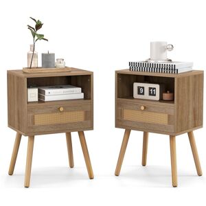 The rattan nightstands set the tone for a bedroom of livable elegance! The exquisite rattan drawer exudes a natural feel while oak wood grain adds a contrasting texture. Featuring a rectangular tabletop, open shelf and pull-out drawer, the end tables provide quick and easy access to your items, such as books, cups, photos and decorations. Meanwhile, the nightstands are stable units, not only for the sturdy wood legs but also for the reinforced screws connection. All in all, the versatile rattan nightstands complement a variety of decoration styles and can be used in the bedroom, living room or office. 17 Stories