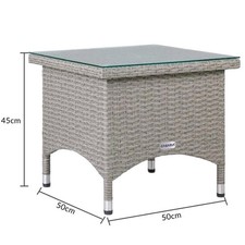 Cosy atmosphere for your indoor and outdoor area These appealing poly rattan side tables give your living environment a very unique flair. Easy to clean high-quality glass plates. The table is made from UV-resistant poly rattan - which can give you pleasure for a long time. Product advantages: UV-resistant poly rattan 5mm thick safety glass plate Suction pads prevent the glass plate from sliding Height-adjustable feet Attractive design Straightforward and fast assembly Technical data: Table made from poly rattan Frame: Galvanised, powder coated steel Glass tabletop Aluminium feet Dimensions: 58 x 58 x 42 cm (22.8 x 22.8 x 16.5 in) //50 x 50 x 45 cm (19.7 x 19.7 x 17.7 in) Load capacity: 80 kg (176.4 lbs, 12.6 stone) Scope of delivery: Side table according to your choice Assembly material Assembly instructions