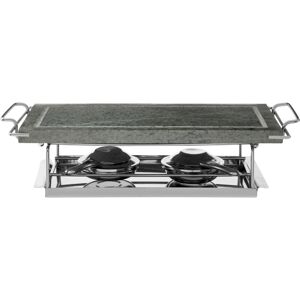 This set replicates traditional grilling with its carved hot stone plate. Its green marble slab with distinctive black graining quickly absorbs the heat and submits it to the top effectively. This set has a sleek chrome finish metal frame, complemented with a matching bottom tray.