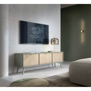 A sleek TV cabinet with three enclosed compartments, designed to transform your entertainment space. This modern marvel combines form and function, providing ample room to stow away media essentials while maintaining a clutter-free appearance. Part of our mid-century modern Scandinavian living room collection that effortlessly transforms your living space into a haven of comfort and sophistication. The warm and inviting finish evokes a sense of nature's embrace, infusing your living room with a cozy yet open ambiance. Both of which harmonize perfectly with the oak tones. The unique golden handles add a touch of luxury and modern twist and elevate the furniture's character. Fjørde & Co Colour: Light Sage/Oak Scandi