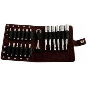 A handy tool kit for the motorcyclist. Stainless steel ratchet with S2 quality bits. Ideal for motorcycles & general use including American Motorcycles: Harley Davidson etc. Stainless steel ratchet. High quality S2 bits: 12 x 50mm bits, Pz Drive Pz1, Pz2, Phillips Ph1,Ph2, Flat 6mm, Star T15, T20, T25, T30 & Hex 4, 5 & 6mm. High quality leather case 150 x 120mm. Chrome Vanadium extended sockets in Alldrive� format: 8, 9, 10, 11, 12 & 13mm. Alldrive� sockets fit a range of profiles including: metric, AF, spline, star, Whitworth & BA.