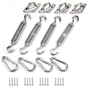 High quality: Made of high quality stainless steel for installing shade sails, durable, rust-resistant, sturdy and safe. Set: Includes 4 wall brackets, 4 carabiners, 4 tension screws and 16 screws. Suitable for all awnings. Practical: The awning clip set is easy to use and perfect for most shade sails to hang your awning safely and easily. Perfect tension: The tension screws ensure optimal tension for your awning.
