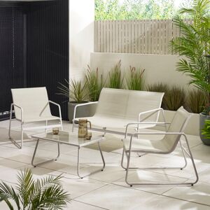 Our Samekia outdoor seating set includes 2 garden chairs, a 2-seat garden sofa and a matching glass-topped table for your patio, deck or conservatory. A modern and simple design with a nod to retro vintage style, we love how unfussy this set is, and how it will go with just about any home decor look. The chairs and sofa are constructed from galvanised steel and matching cream textilene material - a durable, UV and weather resistant high-performance synthetic material designed to last without fading. The matching table is also galvanised steel with a clear tempered glass top. Assembly required - easy to follow instructions are included. 17 Stories Frame Colour: Cream