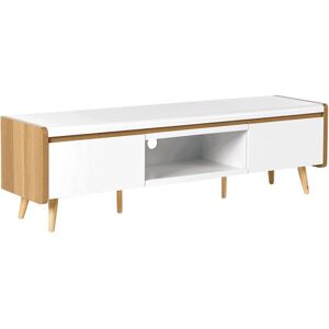 TV Unit for a TV up to 66ʺ. This TV stand with ample storage space will help you keep the room clutter-free. 2 spacious drawers can accommodate all your spare cables, documents, and other important things that you need to keep at hand. An open shelf with a cable management hole is a perfect place for electric devices. The piece thanks to its classic design as well as neutral colours can blend especially well with traditional or Scandi-inspired interiors. The upscale look is highlighted with solid wood legs that guarantee extra stability. Details: Product Type: TV Stand Style: Scandinavian General Color: White, Brown Material Type: Engineered Wood Main Material: MDF Additional Material: Rubberwood Legs material: Wood Top Material: Engineered Wood Shelves number: 1 Drawers: Yes Finish: Melamine Number of Drawers: 2 Dimensions: Depth: 40 cm Width: 160 cm Height: 46 cm Weight: 33 kg Drawer Weight Capacity: 5 kg Shelf Weight Capacity: 5 kg Top Weight Capacity: 50 kg Offer Includes: 1 x TV