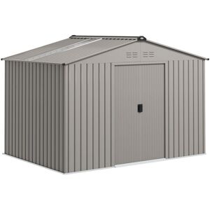 Keep your garden equipment and outdoor essentials locked away securely with this metal shed from Outsunny. Built from galvanised steel for strength, it comes with a lockable double sliding door on the front for easy access and four vents for air to circulate and prevent moisture buildup. The garden tool shed is finished with a protective weather coating and a foundation kit (FLOOR IS NOT INCLUDED). OUTSUNNY 9 x 6FT Galvanised Garden Storage Shed with Sliding Door, Grey in Mid Grey