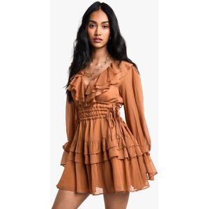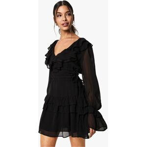 Flirty skater dress with romantic ruffle detailing around the V-neckline Flattering gathered waist design with tie detail for an adjustable fit Floaty chiffon fabric creates beautiful movement when dancing Long sheer sleeves balance the mini-length for a sophisticated silhouette Tiered ruffle hem adds playful dimension to this party-ready piece Make an entrance in this show-stopping skater dress that combines flirty charm with night-out glamour. The gathered waist cinches in your figure beautifully while cascading ruffles frame the V-neckline for a feminine touch. Perfect for those special nights out, this dress pairs brilliantly with strappy heels and a compact clutch as shown on our model. The sheer long sleeves offer just the right amount of coverage while maintaining that head-turning appeal. Style with statement earrings for drinks with the girls, or add a leather jacket for edgier vibes at the club. This versatile Boohoo piece transitions effortlessly from bar to dancefloor, ensuring you'll stand out for all the right reasons while enjoying ultimate comfort throughout your night out.