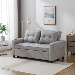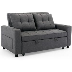 This versatile piece of furniture is designed to effortlessly transform your living space into a cozy retreat, providing comfortable seating during the day and a restful sleeping area at night. Create a beautiful double bed within seconds! With just a simple pull, the seat effortlessly extends, revealing a spacious sleeping area for guests or lounging. The backrest has a clic clac mechanism providing a flat back for a perfect sleeping position. With built in cup holders, keep your favourite beverages within arm's reach and the side pocket storage provide additional space for magazines, remote controls, or other essentials, keeping everything you need close at hand. Gorgeous comfortable padded linen, the Hudson will upgrade any living space for you and your guests. Dimensions: Height: 91cm; Width: 157cm; Depth: 87/162/190cm; Seat Depth: 57cm; Seat Height: 46cm; Seat Width: 126cm; Backrest Height: 51cm; Armrest Height: 60cm More4Homes Hudson 2-Seater Sofa Bed Linen Fabric with Cup Holders in Grey