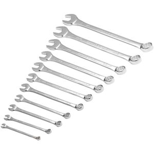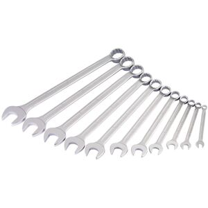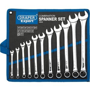 Expert Quality, forged from chrome vanadium steel hardened, tempered and chrome plated for corrosion protection. Draper HI-TORQ® ring end offset at 15°. Jaw offset at 15°. Supplied in Tetron divided wallet with tie cord. Generally in accordance with DIN3113 Specifications Features and Benefits • Contents: 6 - 19mm • Chrome vanadium steel hardened tempered and chrome plated • Draper HI-TORQ® ring ends offset at 15° • Open ends set at 15° • Supplied in Tetron divided wallet with tie cord Contents 11 x Spanners: 6, 7, 8, 9, 10, 11, 12, 13, 14, 17, 19mm.