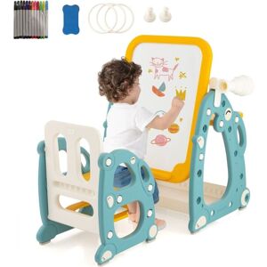 Enhance your child's creativity and organization with this 4-in-1 kids table and chair set. Featuring a magnetic whiteboard, and blackboard, this kids desk set offers a multifunctional space for artistic and educational activities. The ample storage options, including a bookshelf, and fabric bins, keep supplies tidy, such as books, toys, paper, crayons, markers, and chalks. Gift your child an inspiring and educational space for hours of fun and learning. Costway Kids Art Easel & Chair Set Wooden Toddler Activity Table w/Whiteboard in Natural