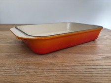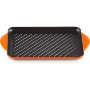 The Le Creuset 32cm Cast Iron Rectangular Grill in Volcanic orange gives you all the delicious flavours of an outdoor grill from the comfort of your kitchen! This cast iron grill plate is perfect for steaks, chicken, fish and vegetables and will seal in moisture whilst giving your food those must-have char lines. Suitable for all hob types, including induction, this cast iron grill can also be popped under the grill. Large handles provide a safe and secure grip and thanks to its slim profile it's easy to store when not in use. Over time the enamel interior of this Le Creuset grill will develop a natural patina that behaves like a non-stick surface. The finish has great food release properties which means less seasoning is required. The Le Creuset 32cm Cast Iron Rectangular Grill in Volcanic orange is made in France and is supplied with a Le Creuset lifetime guarantee.
