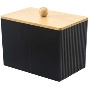 Product Name: This is a black multifunctional storage box. Dimensions: 5.3 x 3.5 x 3.8 inches/13.7 x 8.8 x 9.6 cm. The size is suitable for storing a variety of items. Selected Material: Our cotton swab box is made of high-quality thick acrylic material. The black storage box features a vertical pattern decoration on the side, which not only ensures privacy but also makes it more elegant and easy to clean with water or towels. High-Quality Cotton Swab Container Lid: The lid of our cotton swab storage box is made of high-quality wood, which is smooth to the touch, can better prevent moisture, brings us closer to nature and can become a home decoration. Practical Design: Our cotton swab container has a wider opening and an ergonomic design, making it easy to use. The anti-layer design helps us keep items clean and tidy. Multifunctional use: This cotton swab box can be placed in the bathroom, living room, office, dressing table, etc. and can hold a variety of small items such as jewelry,