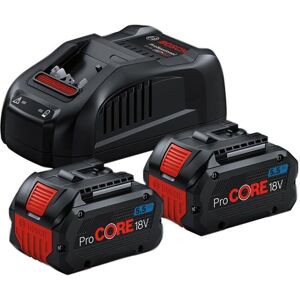 This Bosch ProCORE18V Battery & Charger Starter Kit contains: 2 x 18V ProCORE18V 5.5Ah Li-ion Batteries. Bosch ProCORE18V Li-ion Batteries feature a new generation of cell technology delivering the same performance as standard batteries in an optimised size and weight. The battery also features COOLPACK 2.0 technology for superior heat dissipation from the inside to the outside of the battery. As heat can damage the cells, this COOLPACK 2.0 technology provides an impressive 135% longer lifetime than standard batteries, enabling it to perform for longer work periods. Compatible with all tools and chargers of the Bosch Professional 18V System and the AMPShare Alliance. 1 x 18V GAL 18V-40 Professional Compact Charger with a 4 A charging current for fast charge times. It charges a GBA 18V 4.0 Ah battery up to 80% in only 48 minutes and a GBA 18V 2.0 Ah battery up to 80% within 24 minutes. This compact charger is part of the Bosch Professional 18V System and is 100% compatible with all