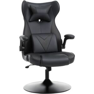 Blending style and comfort, for the gaming room, office and beyond: say hello to this Vinsetto chair. The relaxed shape, faux leather upholstery and swivel base makes it a relaxed, stylish piece: something to both use and look at! Generously padded for comfort, the high back offers support, with flip-up armrests giving you choice. A steel base for support, the 360° swivel works in sync with your body motion. Specifications: ● Colour: Black ● Material: Faux Leather, Metal ● Overall Dimensions: 67W x 71D x 106-112Hcm ● Seat Dimensions: 55W x 53D x 44-49Hcm ● Backrest Size: 55W x 65Hcm ● Armrest to Seat Height: 23cm ● Weight Capacity: 120kg ● Item Label: 921-353V71BK Features: ● Adjustable tilt tension: an enjoyable rocking motion ● 106-112cm adjustable height to match your desk setup ● Flip-up armrests to get in and out of chair easily, also easy to push under tables ● Strong steel base, with a 360° swivel movement ● Curved padded seat, adjustable headrest and movable lumbar support for