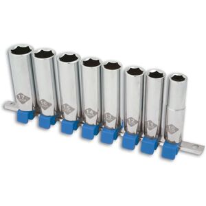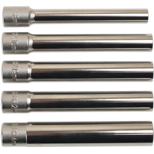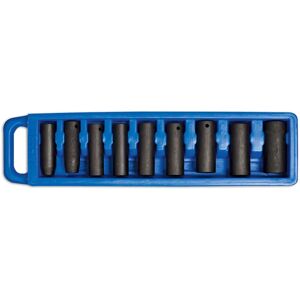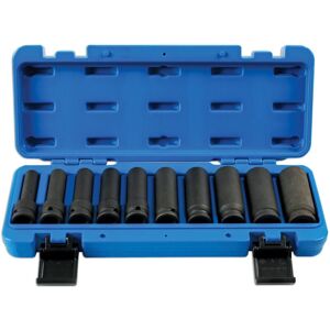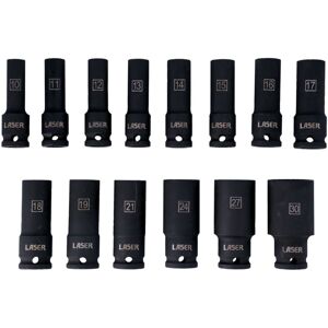 A set of deep impact quality 1/4"" square drive sockets in single hex (6pt) profile. Featuring a longer 50mm depth for improved access over standard sockets. Covers smaller sizes from 4mm to 15mm, including some useful half sizes. Allows the use of impact tools with smaller nuts and bolts. Ideal for quick and easy removal of rusted components and a time saver when there are a lot of fixings. Provided on a socket rail for easy, accessible storage so the sockets are readily to hand. A good value, problem solving set for the workshop. Socket sizes: 4, 4.5, 5, 5.5, 6, 7, 8, 9, 10, 11, 12, 13, 14 and 15mm. 1/4""D x single hex (6pt) x 50mm deep. Manufactured from chrome molybdenum with black phosphate finish. Supplied on a socket rail for safe storage. Set of standard impact sockets 4 - 15mm available, please see Laser Part No. 5961.