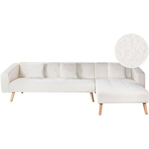 Buttoned Sleeper Sofa. This corner sofa bed is the ultimate centrepiece for your living room. Thanks to a fresh, minimalist design, with the chaise placed on the left side from the sitting perspective, it seamlessly blends in with traditional or contemporary settings. Featuring a soft boucle fabric, it showcases decorative buttons and wooden legs with a natural finish, infusing a sophisticated retro vibe. The extra throw pillows included in the set can be used for additional cosiness and support. The inbuilt click-clack mechanism allows you to recline the back, creating a comfy sleeping space. Details: Product Type: Corner Sofa Style: Retro General Color: White, Brown Shade: Off-White Material Type: Fabric Main Material: Boucle Additional Material: Eucalyptus Wood Filling Material: Foam Material Composition: 100% Polyester Shape: L-Shaped Arm Style: Track Leg Caps/ Pads: Yes Modular Pieces: No Orientation: Left Hand Reclining: No Removable Cushion Covers: No Seat Construction: Sinuous