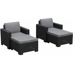 Keter 2 Seat California Balcony Deluxe Set In Graphite The California 2 seater deluxe balcony set is made of more than 83% recycled resin with a 6mm round wicker design. The woven wicker style creates a luxurious and trendy look and can create a focal point in any outdoor space. The set consists of a two armchairs with wide deep seating and two square foot stools with cushions which is perfect for putting your feet up and relaxing or as an extra seating option when hosting indoor's in your conservatory, or outdoors on gardens and patio areas. The cushions included are 7.5cm thick and provide optimal seating comfort to relax and unwind. Lightweight in its structure therefore is easier to move to suit any setting and is easy and quick to assemble. The garden set is completely maintenance-free and weather-resistant, so you can enjoy the lounge set for years to come. Product Features: Ideal indoor/outdoor lounge set for gardens, conservatories and entertaining spaces Built for comfort
