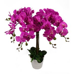 Our exquisite artificial bush orchid serves as a stunning centerpiece for any table. This grand flowering plant boasts large dark pink flowers and meticulous attention to detail. Standing at an impressive 85cm high and 70cm wide when displayed as depicted in our images, it features 9 leaves and 56 flowers. The intricate craftsmanship is truly remarkable. Delivered in a plastic pot, measuring approximately 16cm (w) x 13cm (h), it can easily be transferred to a larger planter for an even more striking presentation. The Seasonal Aisle