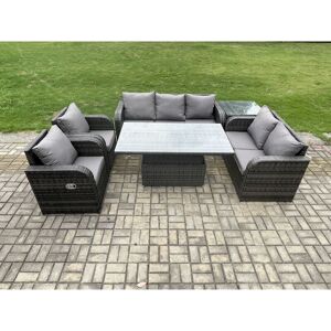 • This deluxe reclining rattan sofa set is a great addition to patio or garden, made of high quality PE rattan and durable galvanized steel construction for sturdiness and long lasting.Durability ,and can be put outdoor all year round. Perfect set to sit round with your family and friends. • Set Dimensions: • 1 x Big footstool :65L x 65W x 34H cm • 2 x Small Fully Assembled Footstool: 40L x 40w x 34H cm • 2 x 3 seater Sofa Size: 177W x 67D x 79H cm • 2 x Reclining Chairs: 74L x 67W x 79H cm • 1 x Lifting Rising Table : 140L x 80W x 68/48H cm (height up 68,down 48) • Dark grey mixed rattan with dark grey fabric .Color may some difference due to light or monitor .we are unable to return the item due to color problem . The 2 armchairs are adjustable, you can adjust the inclination of the chair back from 90°-130° through the button . • Table Can Be Used Both For Coffee Or Dining Table,Cheap Price Compared With Other On Or Offline Store For Rising Table Set. • Items Comes Flat Packed And
