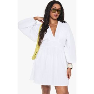 Crafted from lightweight cheesecloth fabric for breathable comfort Flattering V-neckline creates an elongating effect Statement blouson sleeves with elasticated cuffs for a dramatic silhouette Fitted empire waistline transitions into a flirty skater skirt Designed in a relaxed fit that skims the body beautifully This breezy skater dress showcases the perfect balance of comfort and style for your casual wardrobe. The lightweight cheesecloth fabric creates a soft, textured look whilst the voluminous blouson sleeves add a touch of drama to an otherwise simple design. The empire waistline defines your shape whilst the flared skirt offers a flattering fit for all figures. Style with trainers and a crossbody bag for daytime outings, or dress it up with ankle boots and statement jewellery for family gatherings. The versatile design makes it ideal for garden parties, brunches with friends, or relaxed weekend adventures. This Boohoo dress embodies effortless style that works across seasons - simply layer with a denim jacket when the temperature drops.