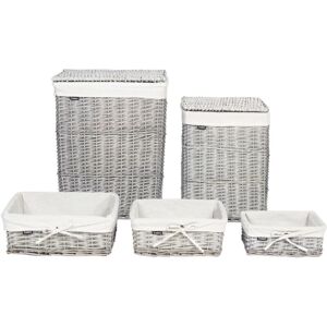 Willow Wood Baskets Set. This beautiful set of 5 handmade willow baskets brings a natural charm to any room. The set includes 3 smaller baskets and 2 larger laundry baskets with lids, all featuring a removable and washable fabric lining. Each piece is carefully crafted from durable willow, offering both style and functionality. Perfect for keeping laundry or other items neatly stored, these baskets blend practicality with timeless elegance. Details: Product Type: Laundry Baskets Style: Boho General Color: Grey, White Shade: Light Grey Material Type: Wood Main Material: Willow Wood Additional Material: Fabric Material Composition: 73% Polyester Shape: Rectangular Finish: Painted Handmade: Yes Capacity: 50/86 Dimensions: Depth: 34/28/27/23/18 cm Width: 45/38/38/33/28 cm Height: 56/49/15/13/11 cm Overall Dimensions: 34x45x56 Weight: 3.5 kg Offer Includes: 5 x Basket Key Features: Adds a Homely Touch to Any Room, Decorative Yet Functional, Unique Handmade Piece, High-Quality Materials,