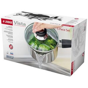 The Judge Vista 5 Piece Draining Saucepan Set is designed for efficiency, allowing you to spend less time in the kitchen and more time with your loved ones. This complete set includes a 14cm milk pan, 16cm, 18cm, and 20cm draining saucepans with glass lids, and a 26cm non-stick frying pan, making it perfect for refreshing your kitchen and enhancing performance. Built for impressive cooking results, the ‘hot forged’ bases provide even heat distribution across all hob types, including induction. The double-sided draining lids make straining effortless while also allowing for adjustable steam release. Internal time-saving measuring guides add extra convenience, while shatterproof, vented glass lids prevent overboiling. For safe and secure handling, the pans feature easy-grip, phenolic low-heat transmission handles that stay cool during cooking. The 26cm frying pan boasts an Excalibur non-stick coating, combining the toughness of stainless steel with superior food release, making it long-lasting and easy to clean. Oven safe up to 180°C and dishwasher safe, this durable and traditional set is backed by a 25-year Judge guarantee and a 10-year non-stick warranty, ensuring quality and reliability for years to come. Judge Vista 14cm Milk Pan : Capacity: 900ml, Dimensions: 9(H) x 15(W) x 31(L) cm., Weight: 482g. Judge Vista 16cm Draining Saucepan : Capacity: 1.5L, Dimensions: 14.5(H) x 18(W) x 32(L) cm., Weight: 1.1kg. Judge Vista 18cm Draining Saucepan : Capacity: 2L, Dimensions: 16.5(H) x 20(W) x 34.5(L) cm., Weight: 1.45kg. Judge Vista 20cm Draining Saucepan : Capacity: 3L, Dimensions: 18(H) x 22.5(W) x 38.5(L) cm., Weight:1.78kg . Judge Vista 900ml 14cm Milk Pan : Dimensions: 7(H) x 26(W) x 45(L) cm., Weight: 1.11kg.
