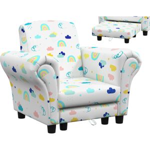 Transform your little kids space with the AIYAPLAY kids sofa set, featuring a charming cloud print. This two-piece set includes a comfy kids armchair and a clever mini sofa stool that tucks away for easy storage. Crafted with soft fabric, padded sponge and stable wood, it's a delightful addition for any toddler's play area or bedroom. Suitable for children aged 1.5-3 years.- Two-piece set includes armchair and stool for versatile use; - Stool can fit neatly under the armchair; - Cute cloud print sparks children's imagination and enjoyment; - Soft fabric and padded sponge for comfortable seating; - Stable wood construction ensures durability and safety; - Suitable for ages 1.5 to 3 years; - Easy assembly required;- Colour: White; - Material: Wooden Frame, Sponge, Polyester, Plastic; - Sofa: 57W x 42.5D x 46Hcm; - Stool: 31W x 31D x 13.5Hcm; - Seat: 30W x 30D x 21.5Hcm; - Backrest: 33W x 30H x 6.5Dcm; - Armrest: 41L x 13W x 34Hcm; - Maximum Load: 45kg (sofa), 20kg (Stool); - Recommended Age: 1.5-3 years old; - Qualification Age: 18M+; - Qualification: BS5852, EN17191, EN71-3; - Item Label: 310-083V70WT; Isabelle & Max