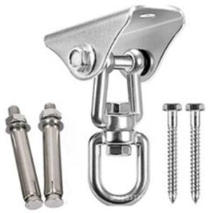 HEAVY DUTY MOUNTING: These stainless steel ceiling/wall hooks are perfect for hanging heavy objects and decorations. Our set includes 1 swivel hook, 2 screws and 2 expansion screws. EASY INSTALLATION: Each punching bag hook has 2 holes for easy attachment to a ceiling or wall. The hex head screws (expansion screws) are made for concrete and the other screws are made for wood surfaces. Our kit is easy to install and no complex assembly is required. The innovative and silent ball bearing design of this hammock swivel hook allows for a full 360° rotation. The hardware will not twist or tangle. MULTI-PURPOSE CEILING SUSPENSION HOOK: Ideal for hanging any suspension, these swivel hooks have many uses. Set up your hammock, swing, hanging chair, aerial yoga strap, punching bag, playground or porch swing, gymnastics ring, Olympic ring or resistance strap. They support your equipment for a long time. Use them for smaller decorations, like planters, lanterns and other light fixtures.