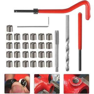 [Thread Repair Kit] One set includes 25pcs M6 screw nuts, 2 repair wrenches, 1 6.2mm twist drill, 1 tap, 1 hex wrench, complete tools, enough to repair the damage of M6 screw nuts, use this kit to repair the wire intact [High-quality corrosion-resistant material] The M6 steel wire sleeve is a new type of internal thread screw fastener, which is made of high-strength and high-precision diamond-shaped stainless steel wire. The surface of the repair wrench is processed by electrophoresis, twist drill and tap. This is a hexagon wrench made of HSS material and nickel-plated material. [Easy to use] First drill holes with a twist drill, then re-tap with a tap, then insert the screw into the groove and screw it tightly. Insert the screw into the screw hole with a T-shaped handle, then use a safety pin to break the crossbar of the screw and screw it in forcefully, the repair is completed [Professional M6 thread repair tool] This thread repair kit is used to repair damaged or worn M6 threads.