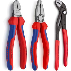 Set of pliers with three important pairs of pliers for the workshop and assembly area Pliers forged from high quality tool steel; oil-hardened Knipex 3 Piece Best Sellers Pliers Set Three pairs of indispensable, frequently bought pliers in one set: the Knipex 03 02 180 combination pliers, the Knipex 70 02 160 diagonal cutters and the Knipex Cobra high-tech water pump pliers. These three pairs of pliers give professional users a reliable, tried and tested basis for workshop equipment. The pliers are forged in Wuppertal from quality, specially selected tool steel, oil-hardened and manufactured according to Knipex quality criteria. For a long tool life, for years of pleasure working with the tool. CONTENTS 1x 03 02 180 Combination Pliers 180mm 1x 70 02 160 Diagonal Cutters 160mm 1x 87 01 250 Cobra High-Tech Water Pump Pliers 250mm FEATURES Set of pliers with three important pairs of pliers for the workshop and assembly area Pliers forged from high quality tool steel; oil-hardened