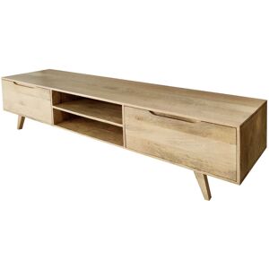 Embrace a modern, minimalist design with this solid wood TV stand. Its open shelving concept provides ample space for your media components, while discreet drawers offer hidden storage. Enjoy the natural wood grain variations that make this piece unique. Corrigan Studio Colour: Natural
