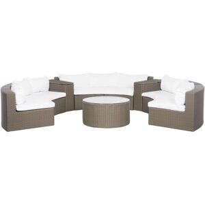 U-Shaped Garden Sofa Set. This U-shaped sofa set creates a charming corner in a garden or on a patio. It includes nine pieces, offering maximum comfort as well as functionality and stylish design. Each piece comes with soft cushions and a backrest. Constructed from high-quality polyester, with practical removable cushion covers. The set comes with two versatile storage boxes that separate the sofa. They are exceptionally spacious and provide enough storage space for all summer accessories. Boxes can also be used as a handy coffee table. This garden furniture is crafted from high-quality poly rattan - exceptionally durable, long-lasting and weather-resistant material. Details: Product Type: Lounge Set Style: Boho General Color: Brown, White Shade: Dark Brown Material Type: PE Rattan Main Material: PE Rattan Additional Material: Fabric Material Composition: 100% Polyester Shape: Round Finish: Powder Coated Seat Foam Density: 25 kg/m3 Seats Up To: 9 People Dimensions: 3 Seater Sofa