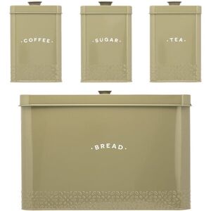 Bring a touch of style and organization to your kitchen with the Artisan Street Moss 4 Piece Kitchen Storage Set, which consists of Tea, Coffee & Sugar storage canisters and a matching bread storage bin. Made from powder-coated metal in an enchanting moss colour, this storage set exude elegance and charm. Their embossed design adds depth and character to your kitchen decor, while the white labels serve as practical markers for easy identification of contents. Tea, Sugar & Coffee Canisters - Dimensions: 15(H) x 10(W) x 10(L)cm. Bread Storage Bin - Dimensions: 22(H) x 20.5(W) x 32.5(L)cm.