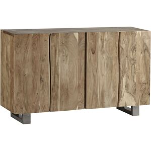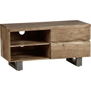 Natural Essential Live Edge Large Media Unit Modern and stylish TV Media Unit, handcrafted from sustainable sourced solid Acacia Wood, featuring 3 drawers and 1 shelf, wide enough to accommodate AV equipment. It is offered in a natural wood colour with a matte finish and complemented with solid metal legs. The uniqueness of this range is given by the variations in the wood, together with the natural knots and slight cracks which add to the character and beauty of every piece. A style combination between traditional and industrial, this TV Unit will offer ample space for to place your TV on, as well as providing enough storage space to hide away magazines, remote controls, CDs, etc. Product Details : Material: Solid Acacia Wood & Metal Adjustable Shelving: No Assembly Required: Only the metal legs will need to be attached using the screws provided in the package. Dimensions : Overall dimensions (LxDxH): 140 x 40 x 45 cm Shelf dimension (LxDxH): 136 x 39 x 17 cm Drawer dimension